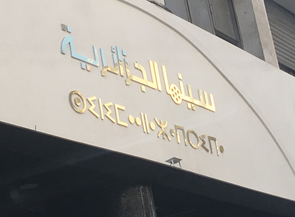 The Tifinagh script (bottom, below the Arabic) on a theater in Algiers, Algeria